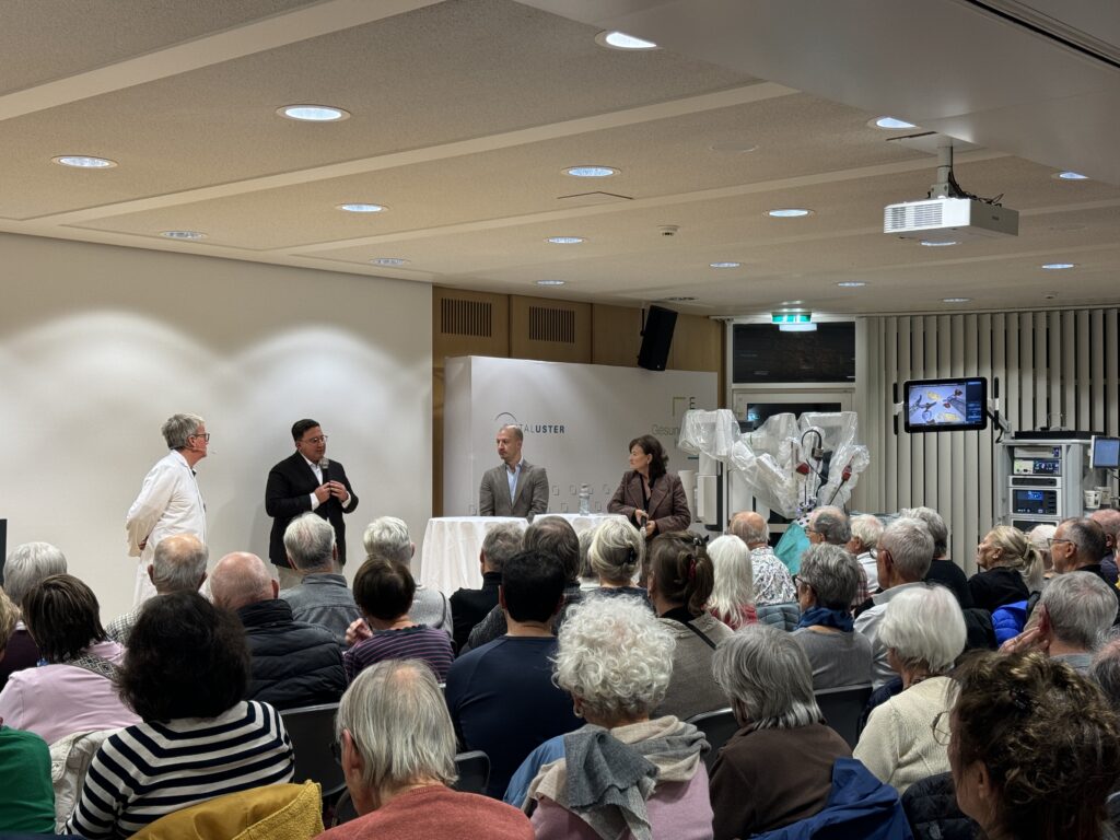 Das Gesundheitsforum zur Robotik war das dritte und letzte einer Reihe gut besuchter Veranstaltungen. Zuvor widmeten sich die Foren den Themen «Husten» und «Unterbauchschmerzen». Zum Abschluss begeisterte das da Vinci-System mit Einblicken in die roboterassistierte Chirurgie. Ein besonderes Highlight: Viele der Gäste konnten selber am da Vinci Platz nehmen, um die Roboterarme zu steuern und ihn hautnah zu erleben.